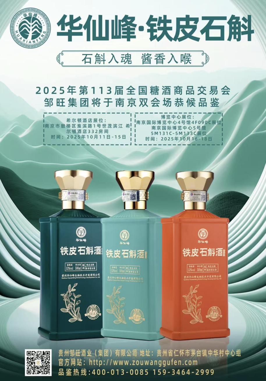 在今年的秋糖,贵州邹旺酒业集团的展位前始终人头攒动——一边是“邹六福”“中福台”等传统酱香产品吸引老酒客上前品鉴,一边是“华仙峰铁皮石斛酒”让嘉宾好奇驻足。