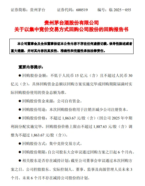 12月24日晚间,贵州茅台公告,拟以集中竞价交易方式回购公司股份,回购金额不低于人民币15亿元(含)且不超过人民币30亿元(含)。公告显示,因公司2025年中期利润分配实施完毕,回购股份价格上限由不超过1887.63元/股(含)调整为不超过...