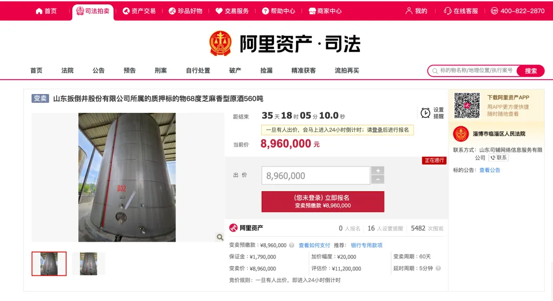 近日,阿里法拍网显示,山东扳倒井股份有限公司(以下简称“山东扳倒井”)旗下560吨68度芝麻香型原酒被公开拍卖,变卖价为896万元,增价幅度为2万元(或整倍数),评估价为1120万元。此次拍卖申请执行人为青岛银行股份有限公司淄博临淄支行。▍...