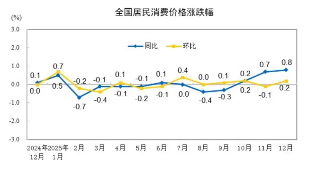 12月份,全国居民消费价格同比上涨0.8%。其中,城市上涨0.9%,农村上涨0.6%;食品价格上涨1.1%,非食品价格上涨0.8%;消费品价格上涨1.0%,服务价格上涨0.6%。2025年全年,全国居民消费价格与上年持平。12月份,全国居民...