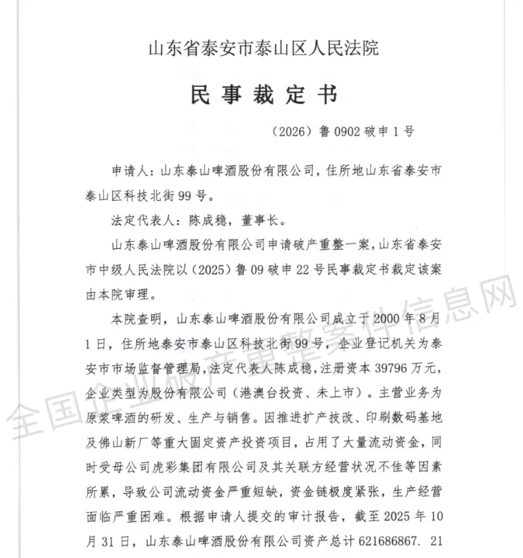 1月13日,山东省泰安市泰山区人民法院作出《民事裁定书》[(2026)鲁0902破申1号],依法受理山东泰山啤酒股份有限公司(以下简称“泰山啤酒”)的破产重整申请,企业正式进入司法重整程序。据法院审理查明,泰山啤酒成立于2000年8月,是一...